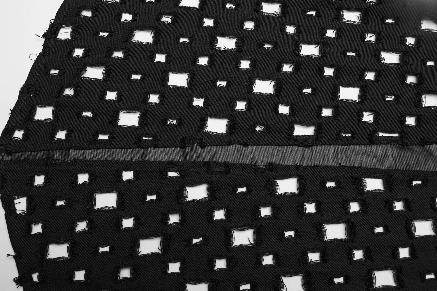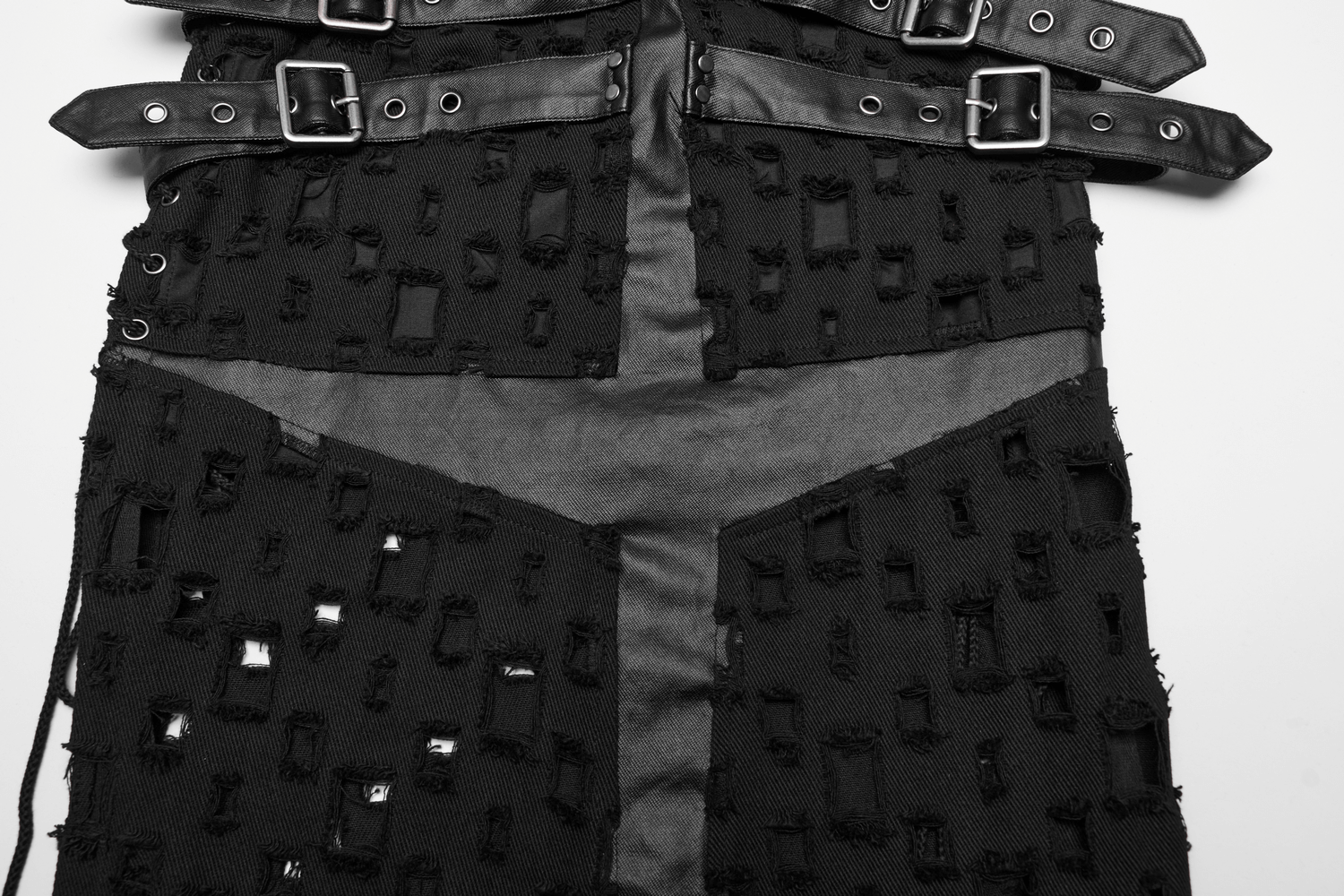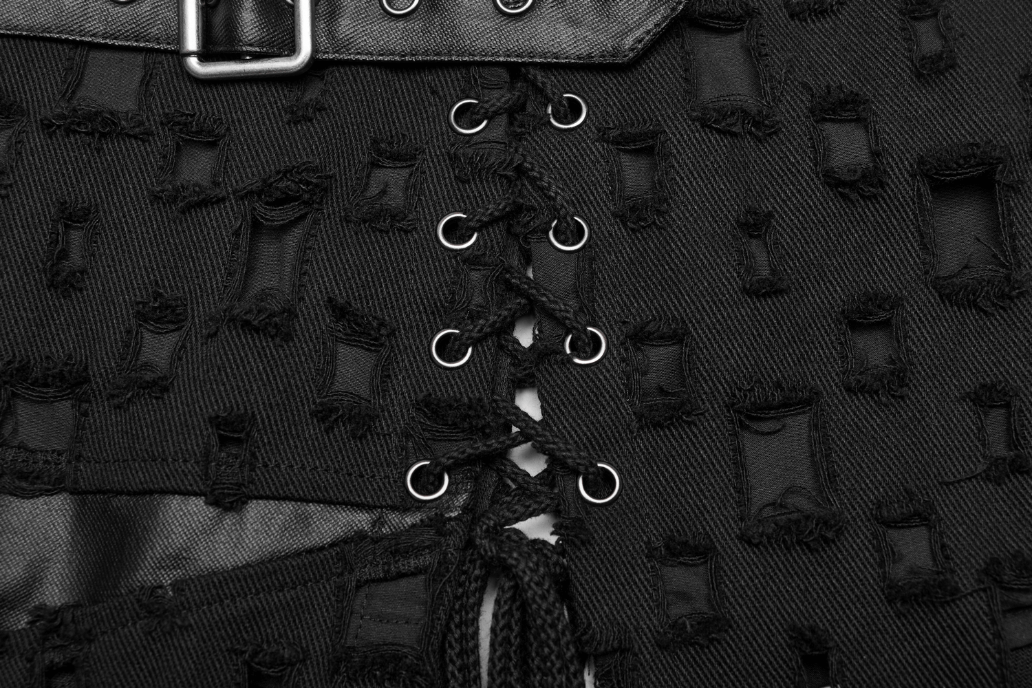 Step out in an edgy style with this skirt. Featuring a tattered punching woven fabric and a unique cross design, this skirt is sure to turn heads. The adjustable decoration at the waist and drawstring for side adjustment provide a perfect and flattering fit. This skirt is versatile, making it a perfect addition to any wardrobe. Whether you're going to a concert, a festival, or just running errands, this skirt is sure to make a statement.