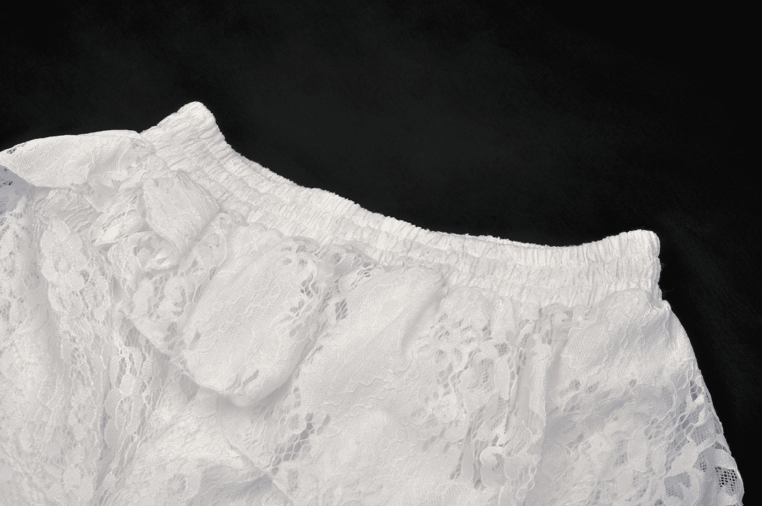 Unleash your inner dark angel in this ethereal white lace skirt. Featuring cascading ruffled tiers, this mini skirt embodies Lolita. The delicate lace adds a touch of femininity, while the edgy silhouette commands attention. Perfect for clubbing, concerts, or strutting your stuff on a moonlit night. This skirt is as durable as it is stylish. Pair with a corset top, chunky boots, and statement jewelry for an unforgettable look.