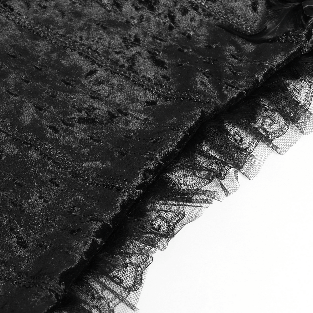 Step into dark elegance with this Gothic hooded cape crafted from soft velvet blend with lace details. Adorned with rose embellishments and ruffled trim, it captures Victorian-inspired mystery. Featuring rabbit fur lace and real feather accents, it adds texture and depth. The pointed hem and dramatic hood make it an iconic accessory for gothic, lolita, or alternative styles.