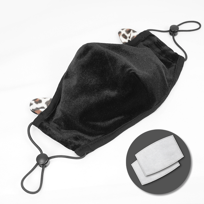Black Gothic Velvet Face Mask With Leopard Ears / Unisex Everyday Masks With Adjustable Ear Loops