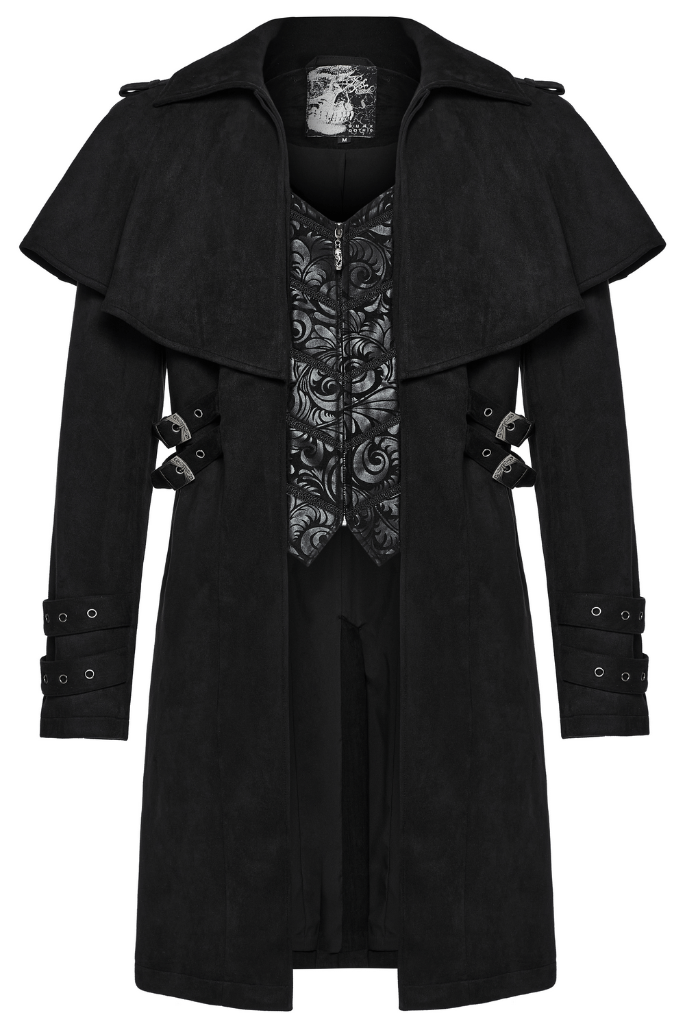 Crafted from soft suede and jacquard fabrics, this gothic-inspired cape coat features a timeless silhouette. Decorative shoulder and cuff loops are adorned with intricately carved hand-sewn buckles. Adjustable waist loops enhance the fit, offering both style and flexibility. Perfect for those seeking a unique gothic aesthetic with fine detailing and a dramatic cape design.