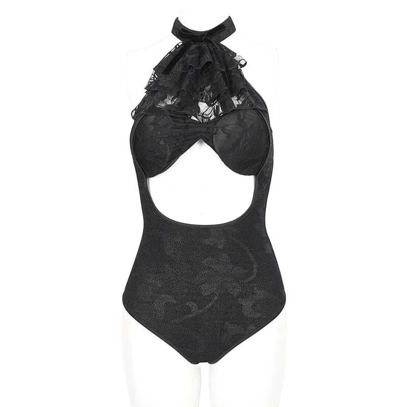 Unveil your shadowy allure with our vintage black cutout one-piece swimsuit. This unique gothic cloth is a stylish nod to vintage elegance, featuring a flirtatious cutout design, romantic lace ruffle and a chic bowtie accent. Crafted in an eternal black hue, this swimsuit redefines alternative beach fashion. Dive into your summer adventures wearing this eye-catching piece and make your mark on the sands of time.