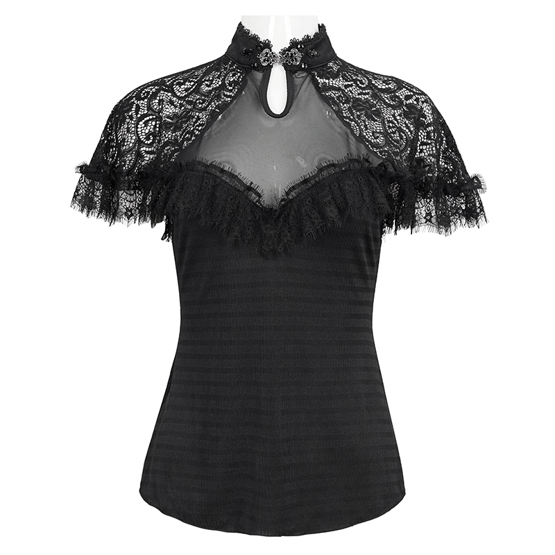 Black Vintage Lace Short Raglan Sleeves T-Shirt For Women / Gothic Female V-Neck Slim T-Shirts