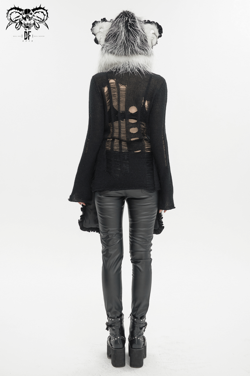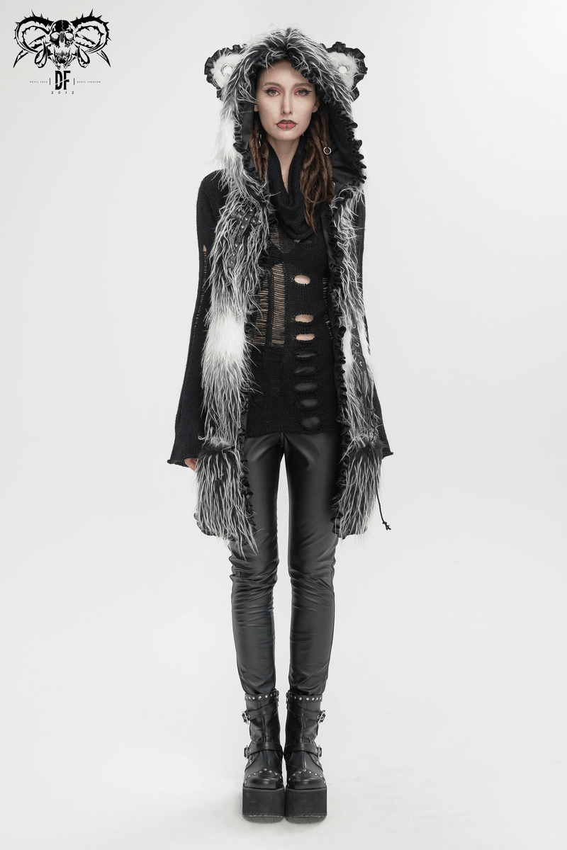 Cute Gray Animal Ear Flap Hat with Paws Gloves / Warm Faux Fur Hood with Rivets