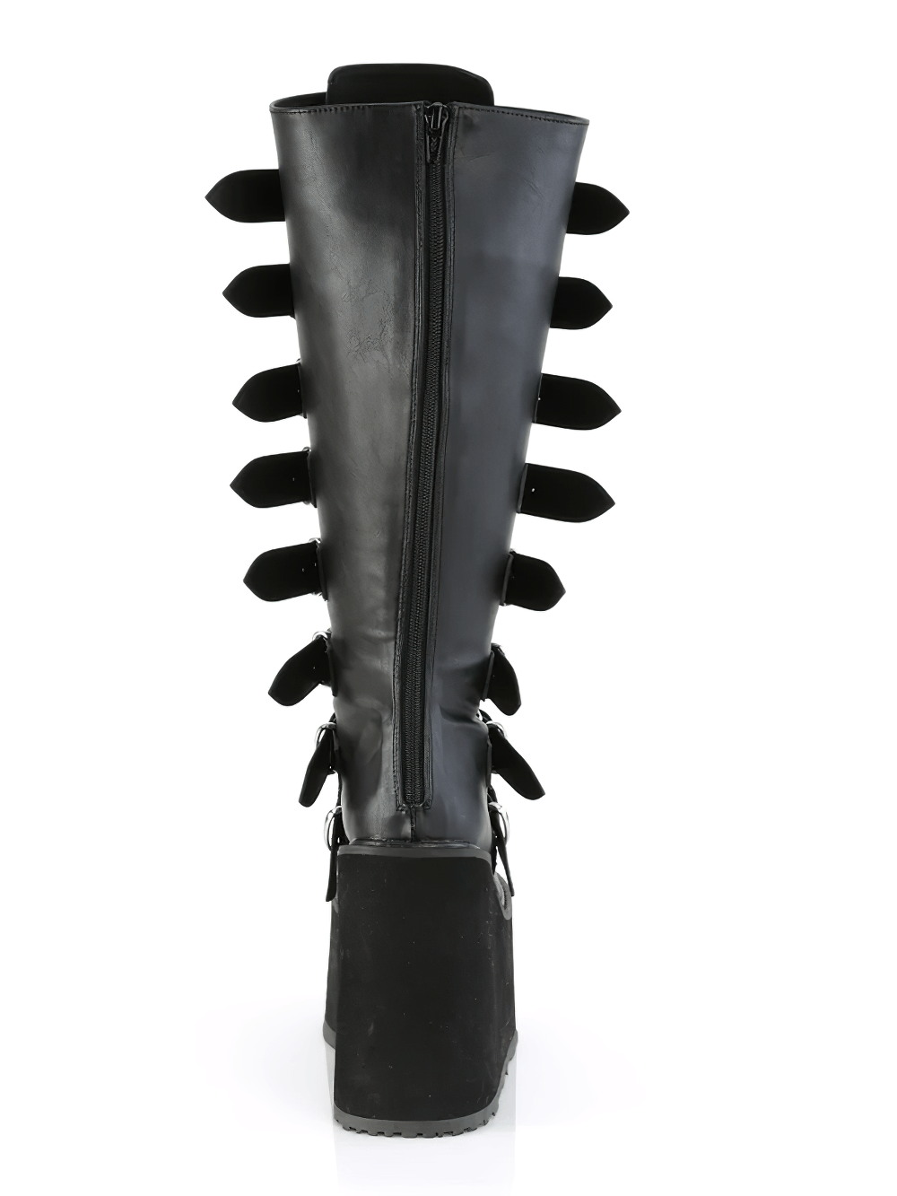 Unleash a bold new look with our stylish knee-high boots, featuring a 5 1/2-inch platform for standout style. Adorned with eight robust buckle straps and striking metal plates, these boots command attention. The wide calf design ensures a comfortable fit, while the back metal zip makes them easy to wear. Crafted from durable vegan leather, these boots are perfect for those who love to make a fashion statement. Versatile yet daring, they’re an essential addition to any edgy wardrobe.