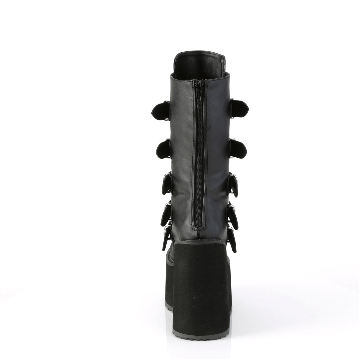 Step into bold fashion with these black platform mid-calf boots, boasting a towering 5 1/2" platform. Featuring five buckle straps adorned with heart-shaped metal plates, these boots offer a unique blend of style and attitude. A back metal zip ensures easy wear, while the vegan leather construction adds durability. Perfect for pairing with distressed jeans or a mini skirt for a fierce look.