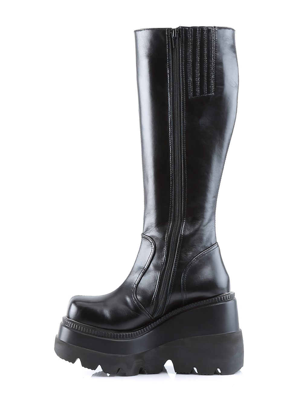 Elevate your style with these knee-high boots featuring a bold 4 1/2-inch stacked wedge platform. Crafted for those who love a daring look, these boots have a full inner side zipper for easy wear. With a sleek black finish and an approximate 15.2-inch shaft height, they’re perfect for pairing with your favorite edgy outfits. Whether for a night out or a casual statement, these boots will add the perfect amount of height and attitude.