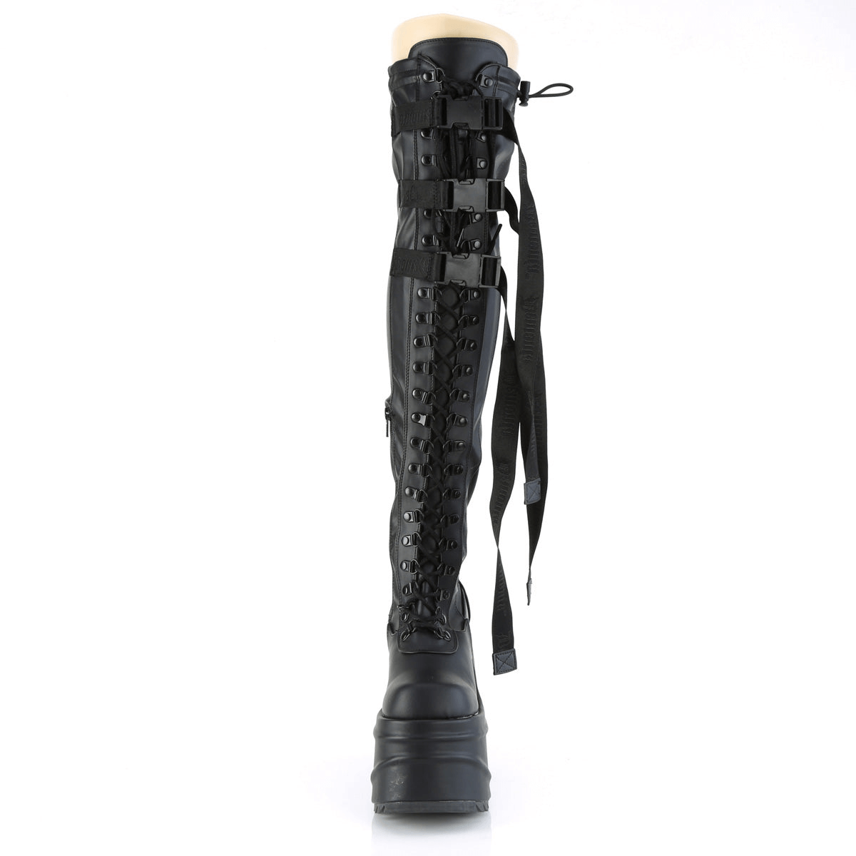 DEMONIA Black Thigh-High Boots with Snap Buckles and Straps