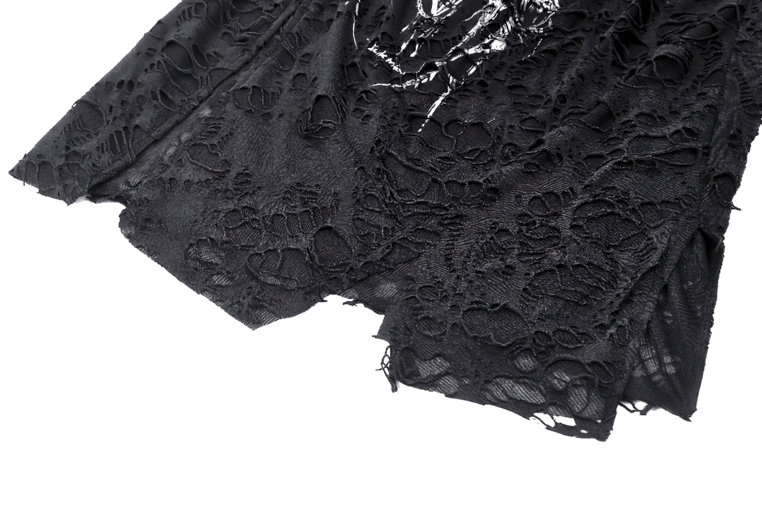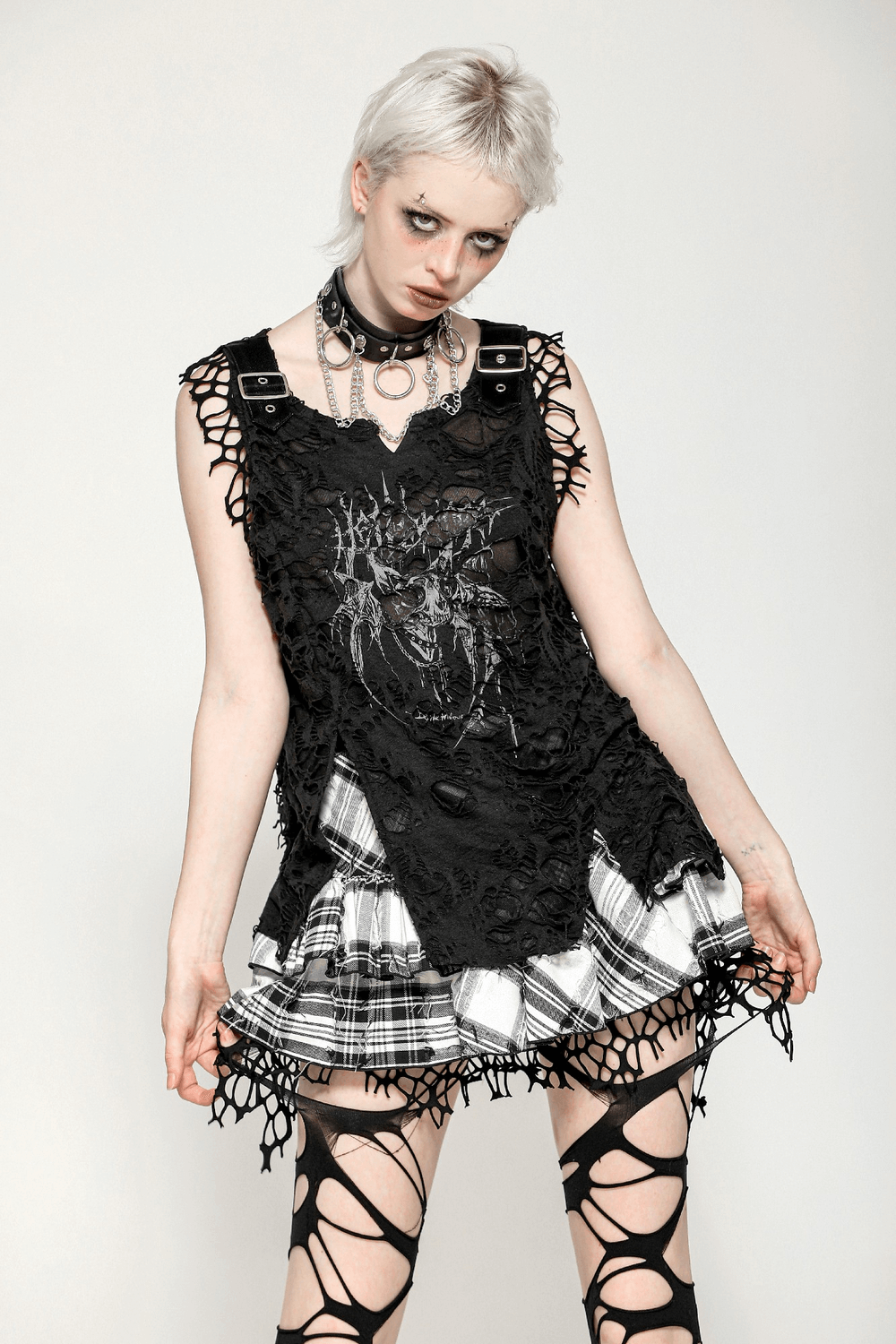 Unleash your inner rebel with this sleeveless black punk top, featuring a shredded net design, asymmetrical hem, and metal buckle straps. The front showcases a fierce skull and crown graphic print that adds a gothic edge. Made from distressed fabric for a worn-in, grunge look. Perfect for layering over mesh or pairing with ripped jeans and boots.
