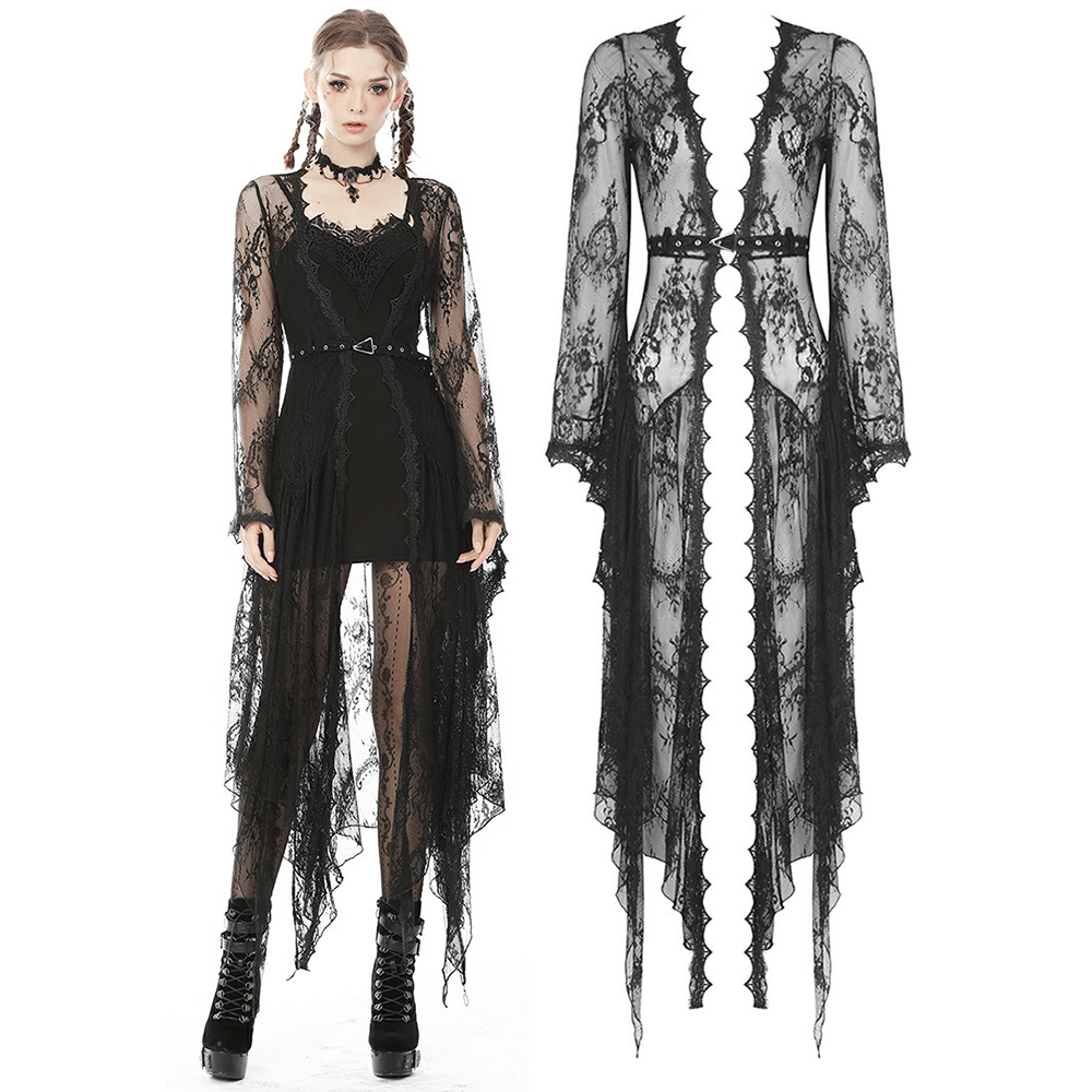 Channel your inner goth princess with this elegant black lace cape featuring dramatic bell sleeves. The airy lace fabric offers a touch of sophistication, while the relaxed silhouette ensures you stay easy and stylish lounging at home or layering over an outfit. This versatile piece is perfect for adding a touch of darkness to your everyday wardrobe.