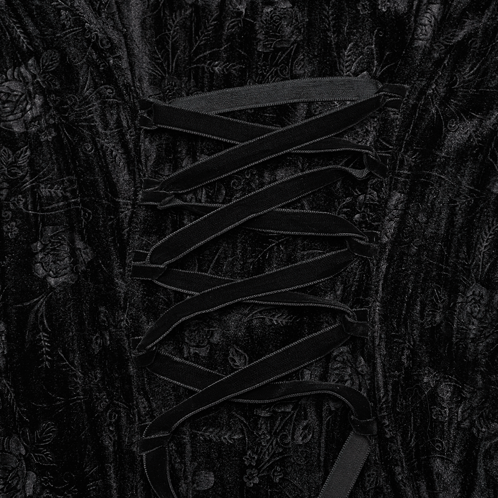 This Gothic velvet dress features a slanted collar with engraved snap buttons, combining classic Chinese style with modern elegance. The wool-trimmed collar and cuffs add sophistication, while appliques on the waist and fur buttons mirror the neckline. The sexy slit hem accentuates the silhouette. With a side zipper, back drawstring, and elastic Gothic print sleeves, it's both sleek and striking.