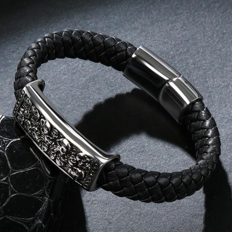 You will be interested in our fashionable model of a men's bracelet in the gothic style. This bracelet is made of genuine leather and has a beautiful shape that you will definitely like. It also has a metal insert with a pattern of skulls as decoration. So order this bracelet and complete your outfits with it.