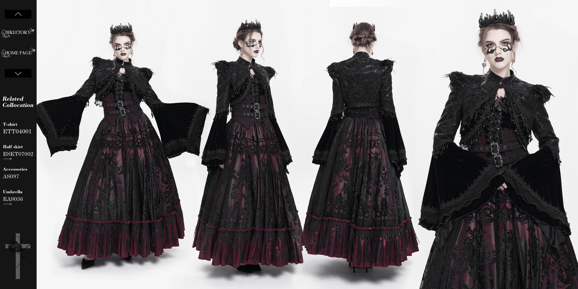 Step into dark elegance with this gothic bolero shrug, crafted from polyester, viscose, and synthetic leather. Featuring dramatic bell sleeves adorned with lace trim and bead tassels, it adds a regal touch to any gothic or Victorian-inspired outfit. Perfect for pairing with corset dresses, this piece delivers a statement silhouette with timeless dark romance.