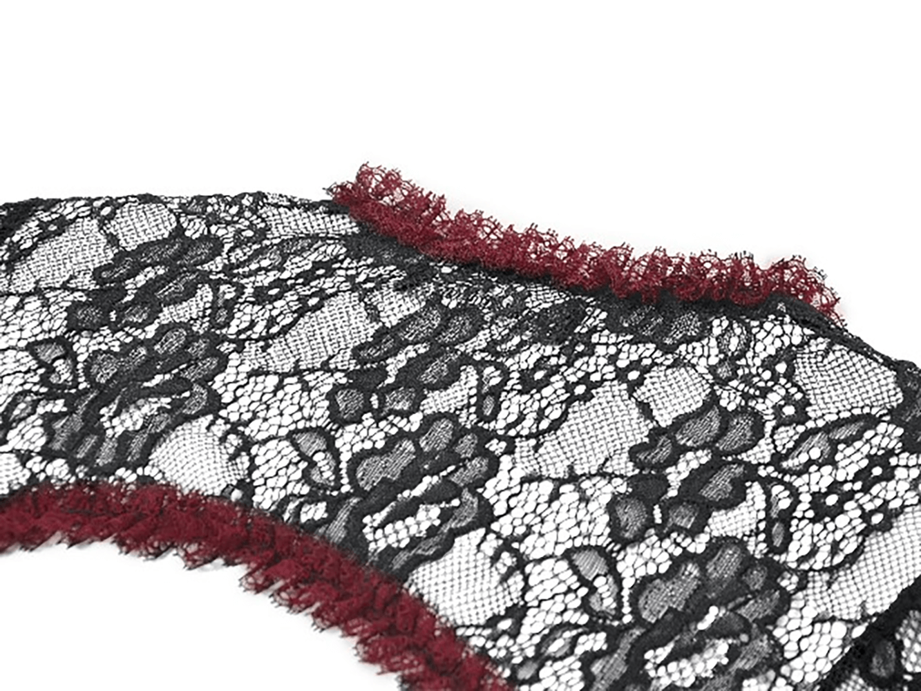 This gothic lace shrug combines dark romance and elegance. Crafted from semi-sheer black lace with deep red ruffled trim, it features dramatic flared sleeves and intricate detailing at the neckline. Perfect for layering over corset tops or dresses, this piece adds a sophisticated Victorian-inspired charm to any Gothic or fantasy outfit.
