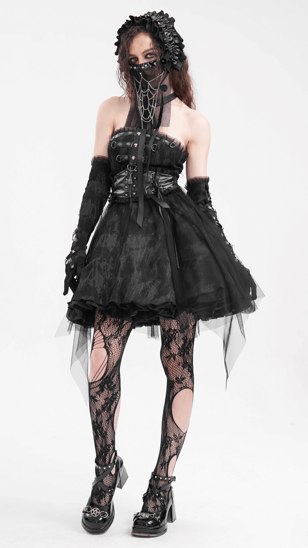 Punk-Inspired Black Mesh Face Veil with Studs and Chains.
