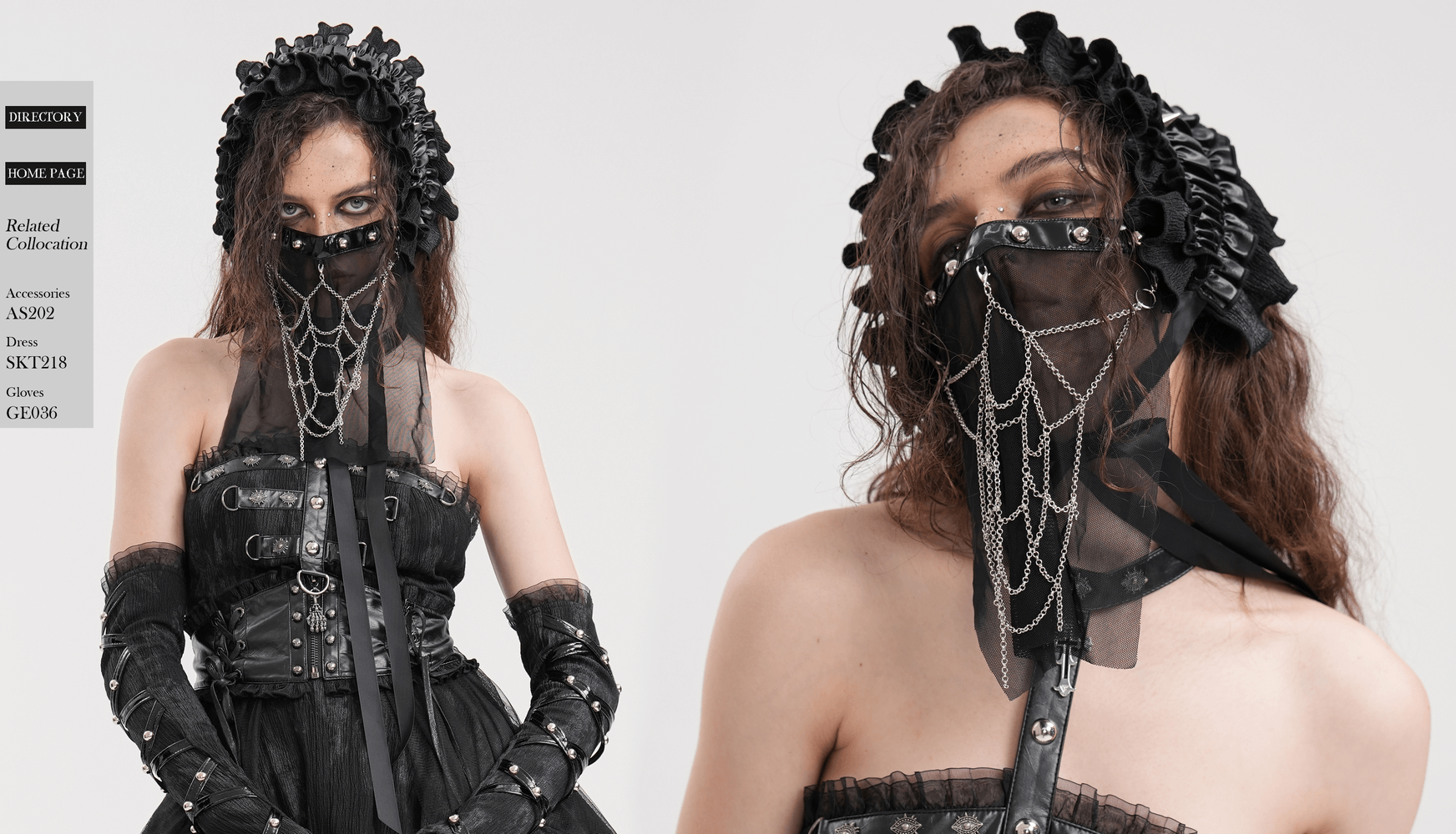 This Gothic-inspired black mesh veil is a striking statement piece for any edgy look. Adorned with silver chains and metal studs, it combines punk aesthetics with a mysterious allure. The lightweight mesh and intricate chain details drape elegantly from a studded band, making it perfect for alternative fashion enthusiasts. Add a touch of rebellion and sophistication to your next event or photoshoot.