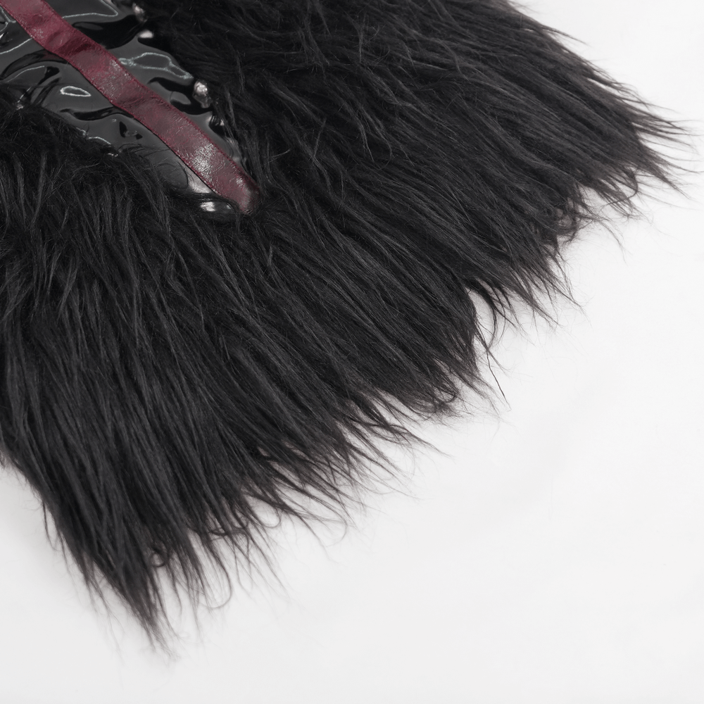 Step into alternative style with these Gothic furry leg warmers, crafted from faux fur and accented by bold red cross straps. Metal studs and buckles add an extra edge to this striking design, while adjustable closures ensure a snug fit. These unique leg covers make a statement and are perfect for completing any punk or Gothic outfit. Embrace dark fashion and turn heads with this eye-catching accessory.