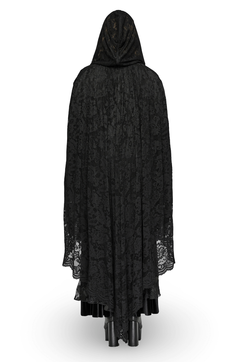 This Gothic lace hooded cape is made of elastic patterned mesh fabric, offering a loose fit with large side seam openings for easy arm movement. The exquisite small lace stitching adds a touch of elegance. The hood features rose lace edges and is adorned with velvet straps, enhancing its intricate design. Perfect for adding a dramatic flair to any gothic or dark fashion outfit.