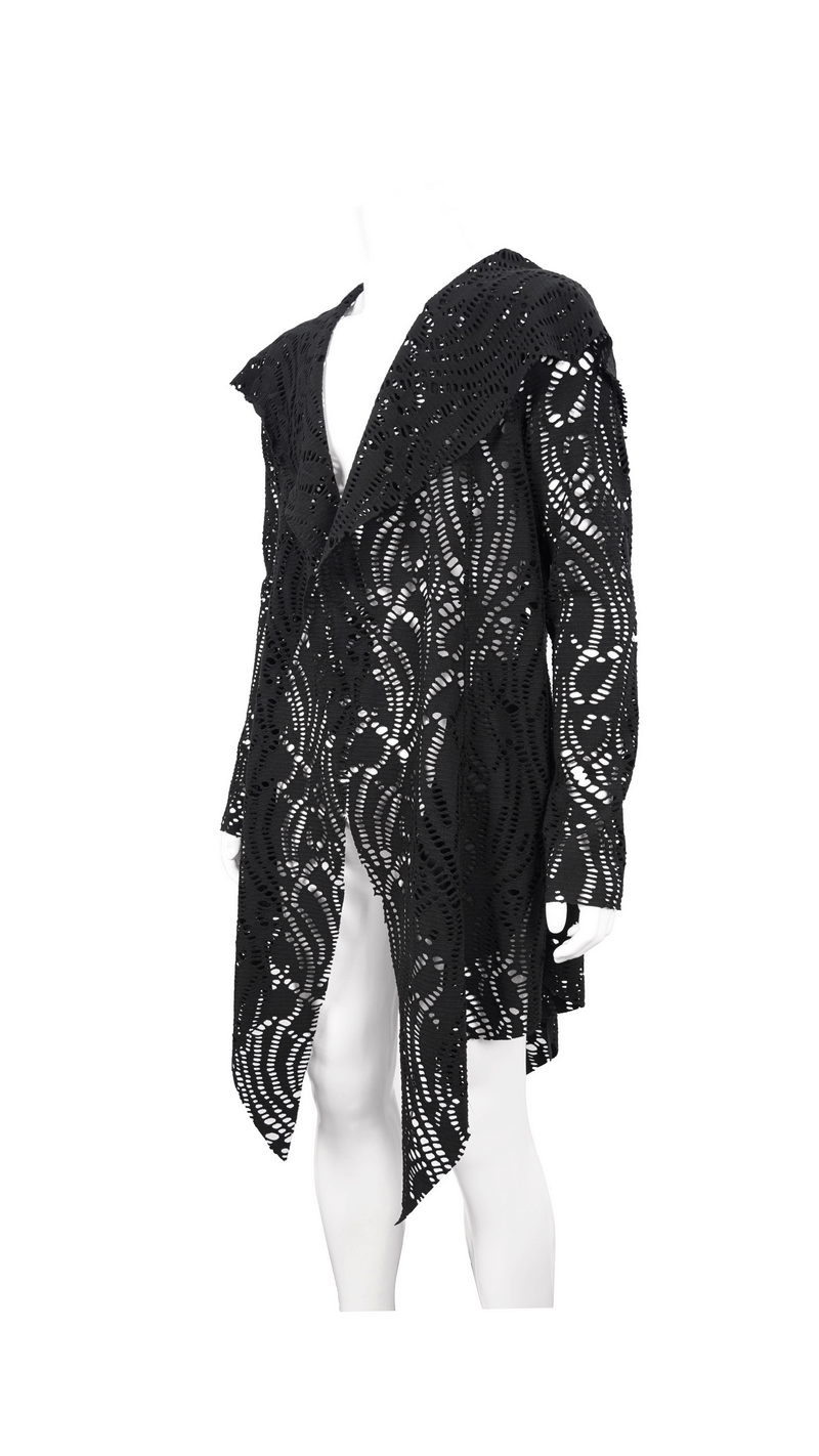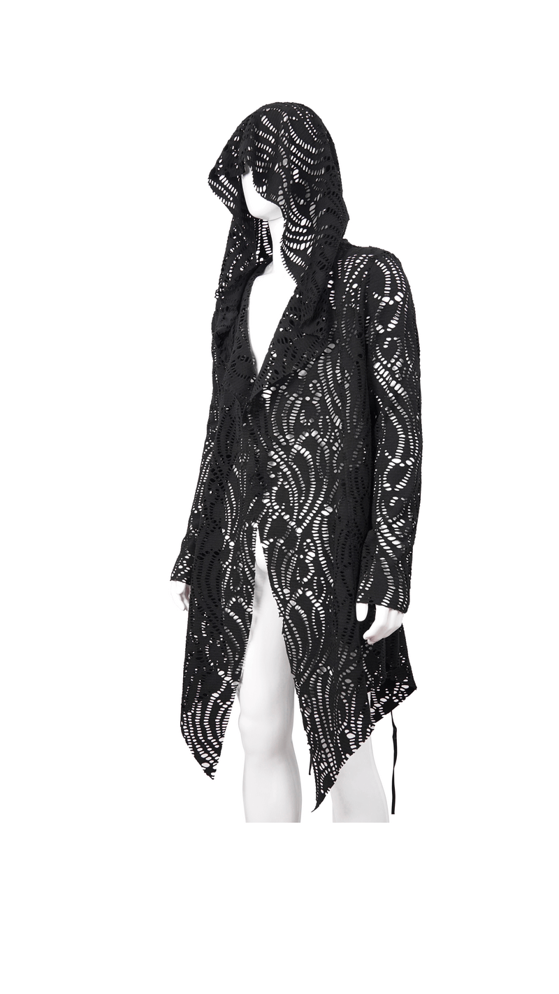 Pay attention to this retro model of men's coat in gothic style. This black coat has an asymmetrical cut and a hood for your comfort, and it is also made of transparent fabric that will add interest to your look. So choose your size and order this retro, gothic coat.