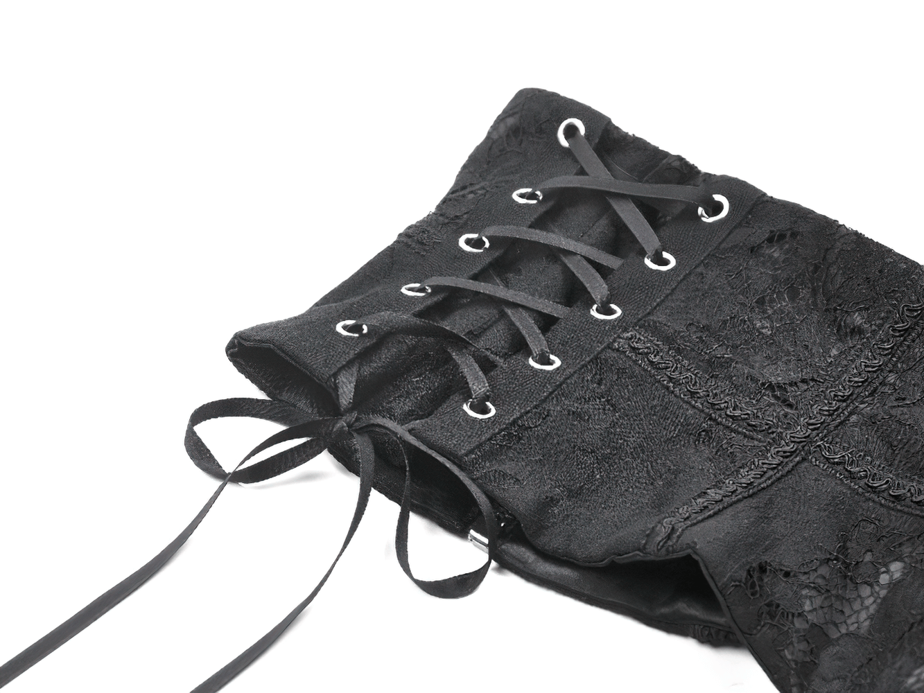 This gothic-inspired black corset features a stunning lace-up design with satin ribbons for an adjustable fit. The structured form, detailed with intricate lace patterns and a front zipper, enhances the bold, edgy look. Perfect for adding a touch of punk style to your outfit, this corset offers both a chic and rebellious aesthetic for any occasion.