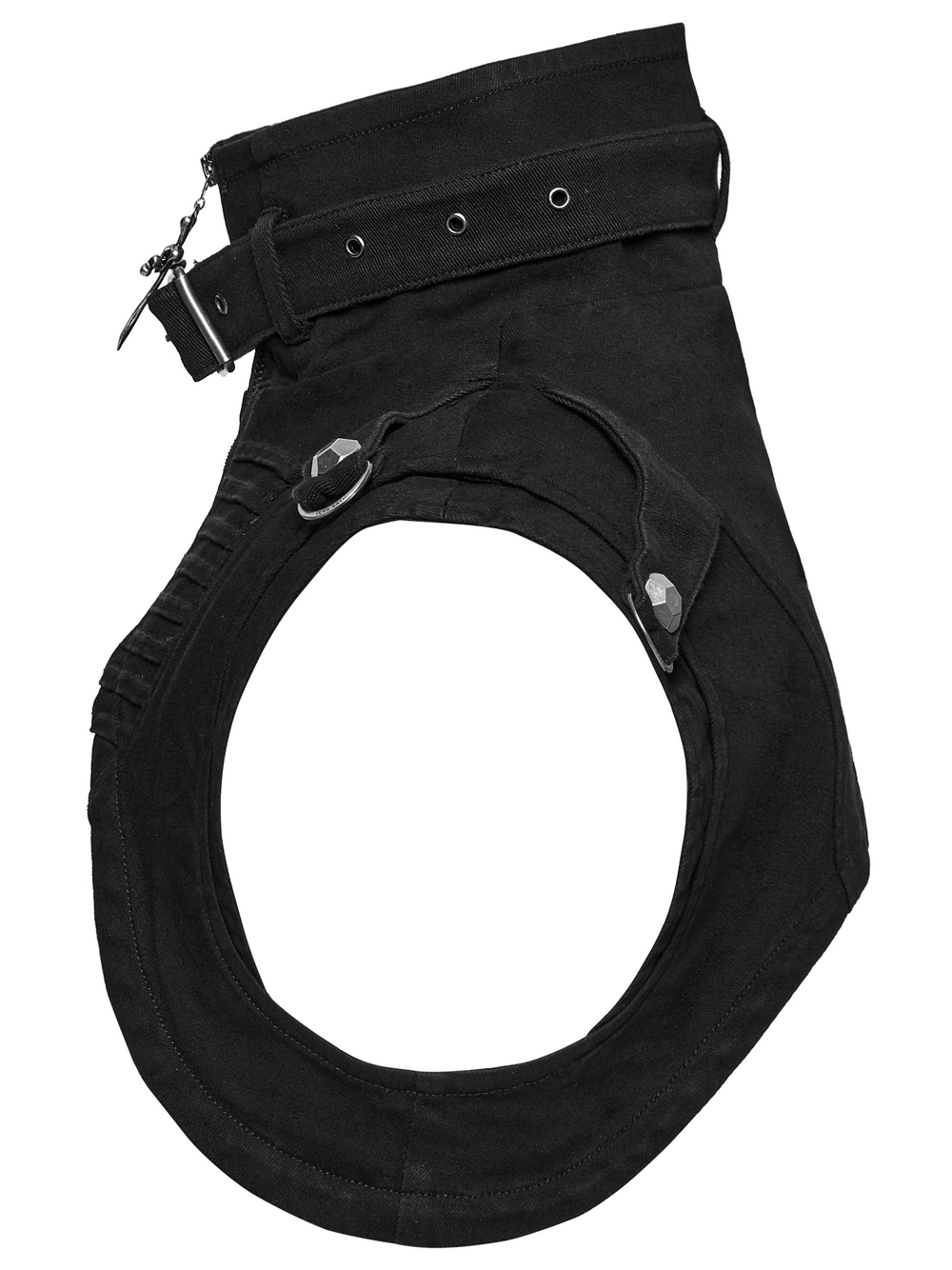 This gothic punk black cape is made of elastic denim for a bold streetwear vibe. It features a stand collar and a unique silhouette design. The front pleats create a layered look while shoulder patches and polygonal studs add standout highlights. Perfect for layering over tops or dresses, this edgy punk denim ultra short cape brings attitude and alternative style to any outfit.