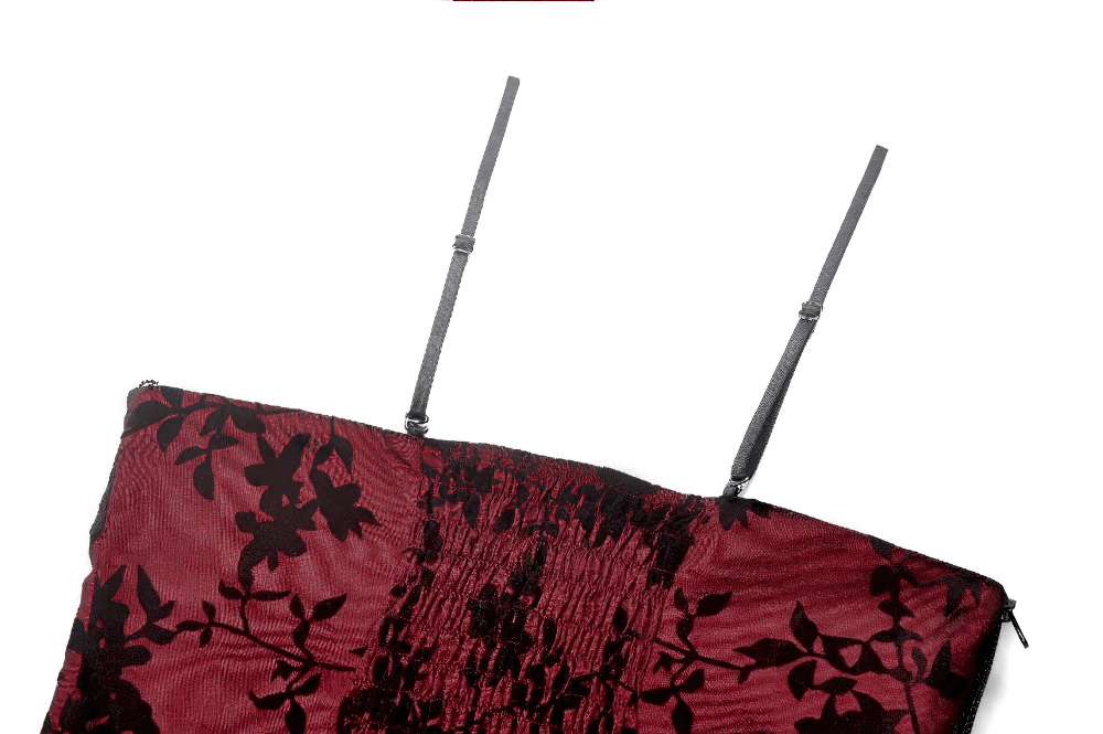 This luxurious satin top features delicate floral lace detailing, with a flattering off-shoulder design. The peplum hem adds a dramatic flair, perfect for gothic and alternative styles. Adjustable straps ensure a customized fit, while the elegant lace trim on the edges enhances the garment's sophisticated charm. Ideal for pairing with skirts or pants for a bold, edgy look.