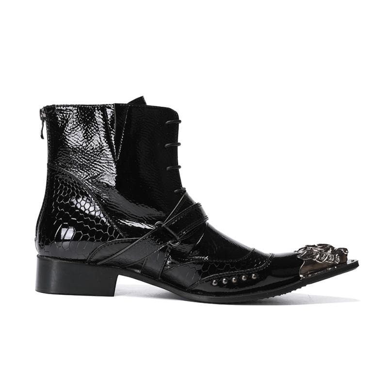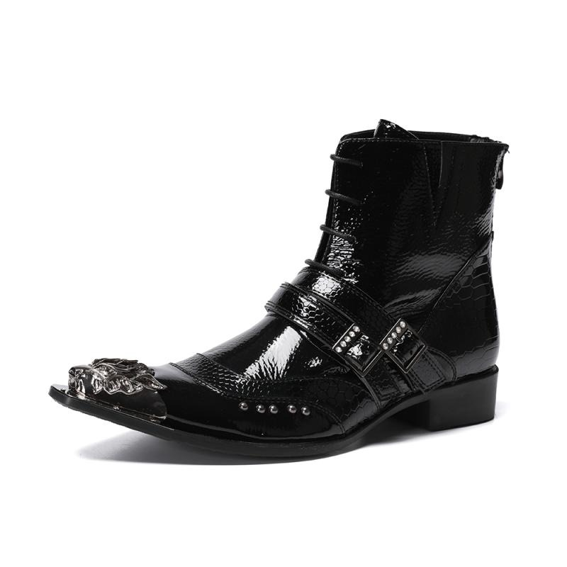Luxury Patent Leather Metal Pointed Toe Boots for Men / Trendy Male Lace Up Ankle Boots with Buckle