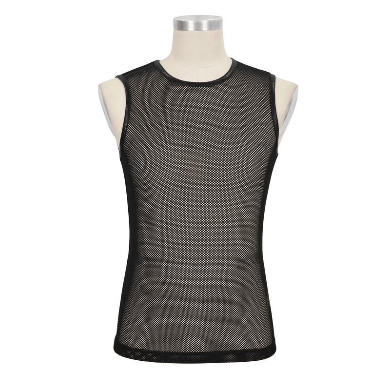 Men's Black Sleeveless Mesh Tank Top / Gothic Round Neck See-Through T-shirt