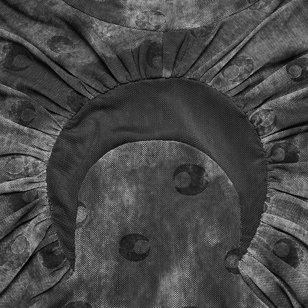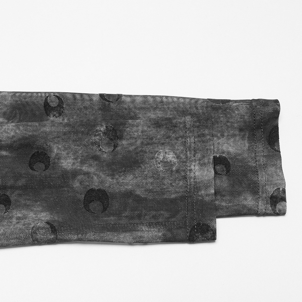 Crafted from soft, elastic crescent-printed mesh fabric, this gothic top features a stand-up collar and a fitted design that accentuates the body. The unique perspective crescent cut-out design creates a striking contrast with the fabric, adding depth and intrigue. Perfect for layering with dark fashion looks or creating a bold statement in alternative streetwear.
