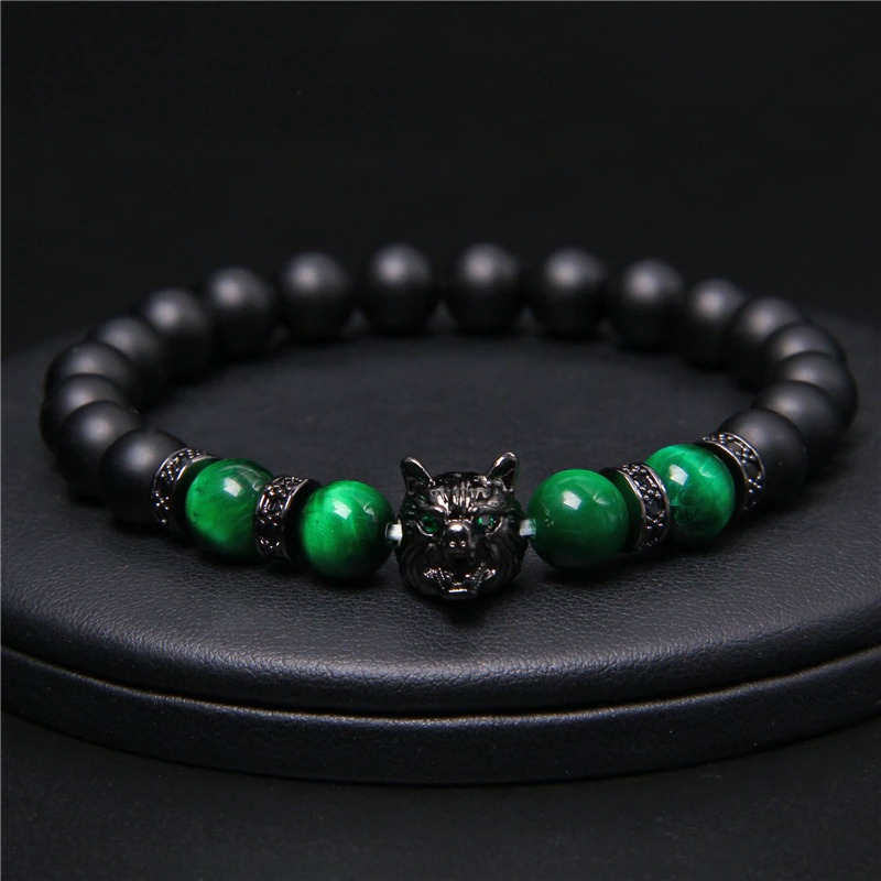 Natural Black Lava Stone Bracelet Wolf Charm / Elastic Jewelry with Animal Symbol