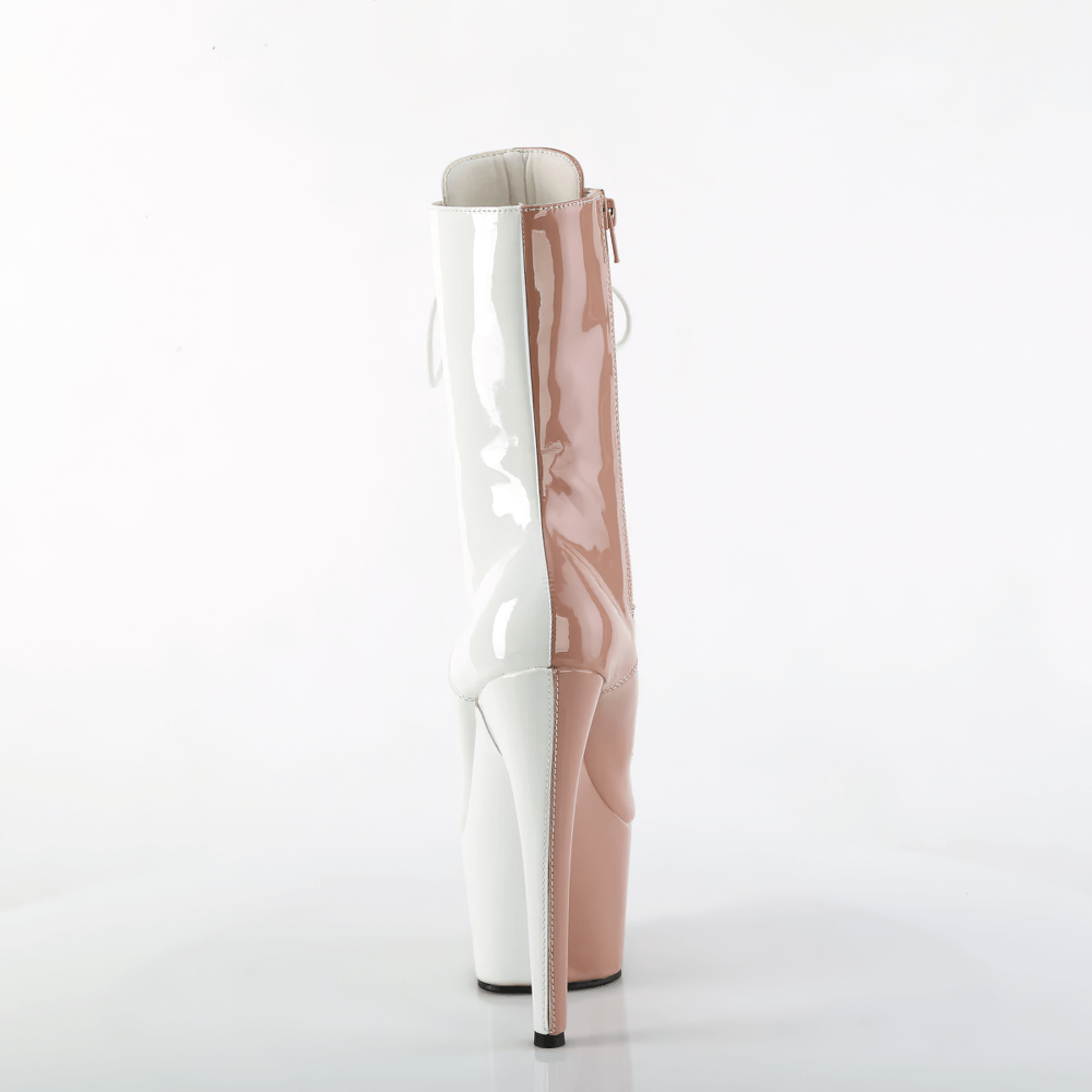 Step into the spotlight with the ankle boots, a striking statement piece that demands attention. Featuring a bold 7-inch heel and a 2 3/4-inch platform, these lace-up boots boast a two-tone design for added edginess. The fully wrapped platform bottom enhances the style, while the inner side zip closure ensures easy wear. Perfect for embracing your inner fashionista and making every step a showstopper.