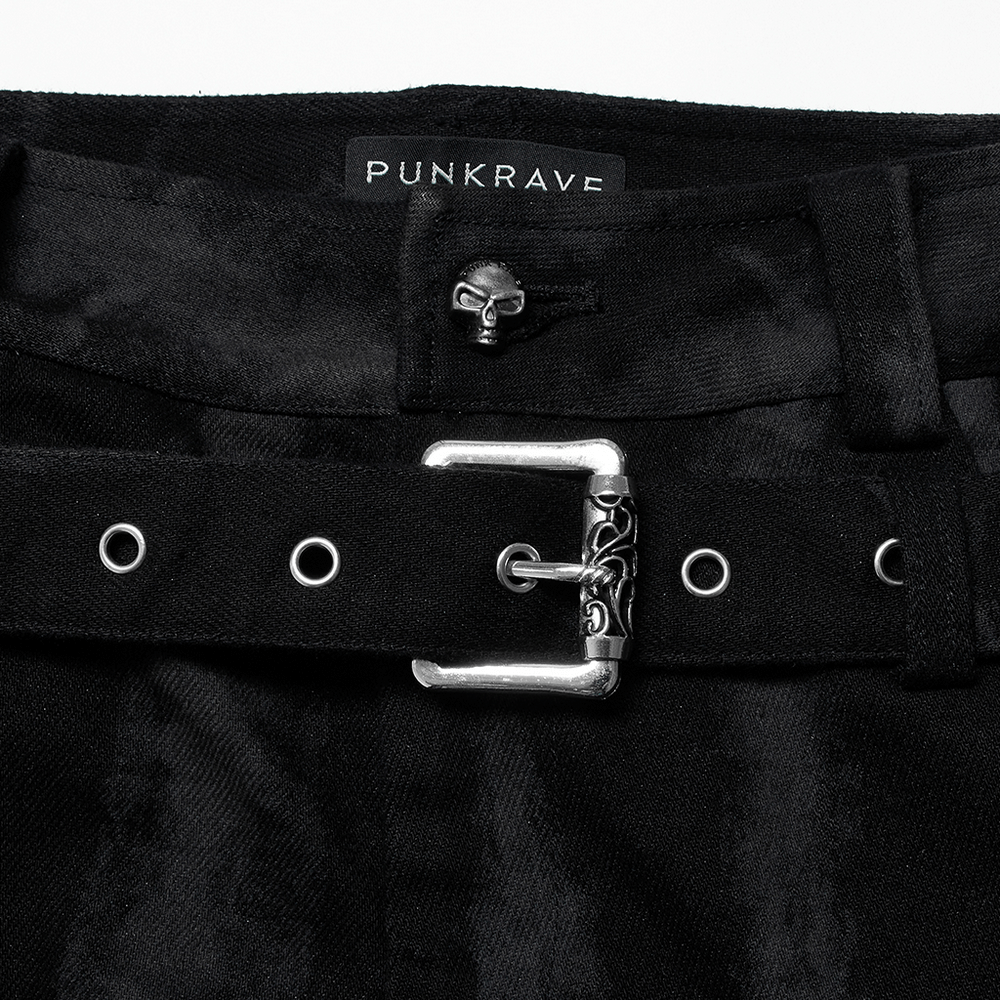 These punk-inspired flare trousers feature a dark texture print that enhances their visual appeal. Made from micro elastic fabric, they provide a structured fit and flexibility. The detachable waist belt adds versatility, while the side drawstring design serves as a decorative touch. Ideal for everyday wear, these trousers make a bold style statement for those seeking an edgy yet practical look.