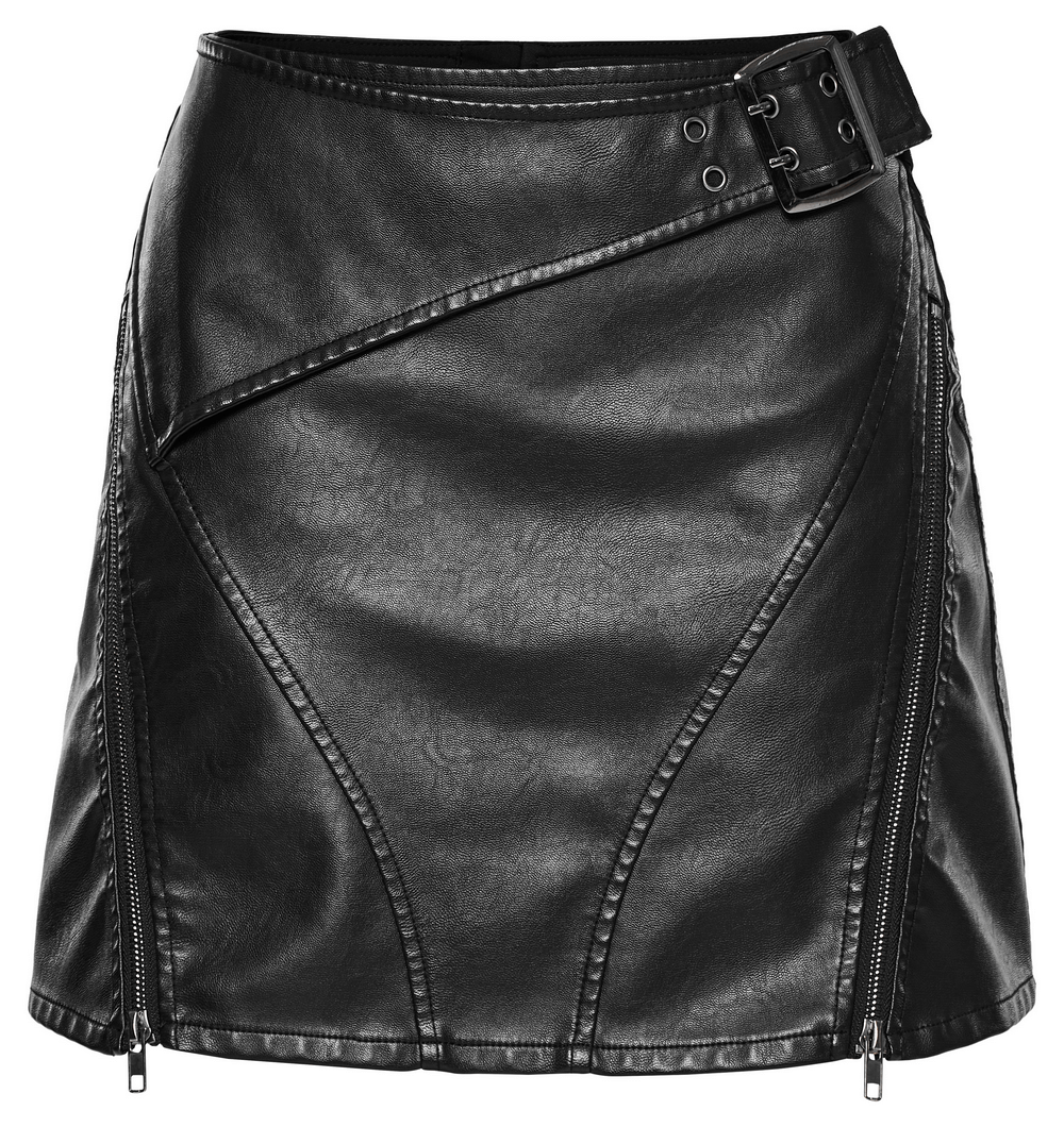Punk Leather Mini Skirt with Mesh Panels and Side Buckle