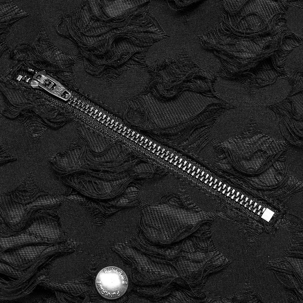 Crafted from a unique blend of composite tattered twill fabric, elastic knit fabric, and twill woven material, these punk-style pants feature detachable snap button connections, allowing for versatile two-piece styling. The tattered knit fabric adds to the rugged aesthetic, while the iron ring webbing along both sides accentuates the curves of the legs for a bold and daring look.