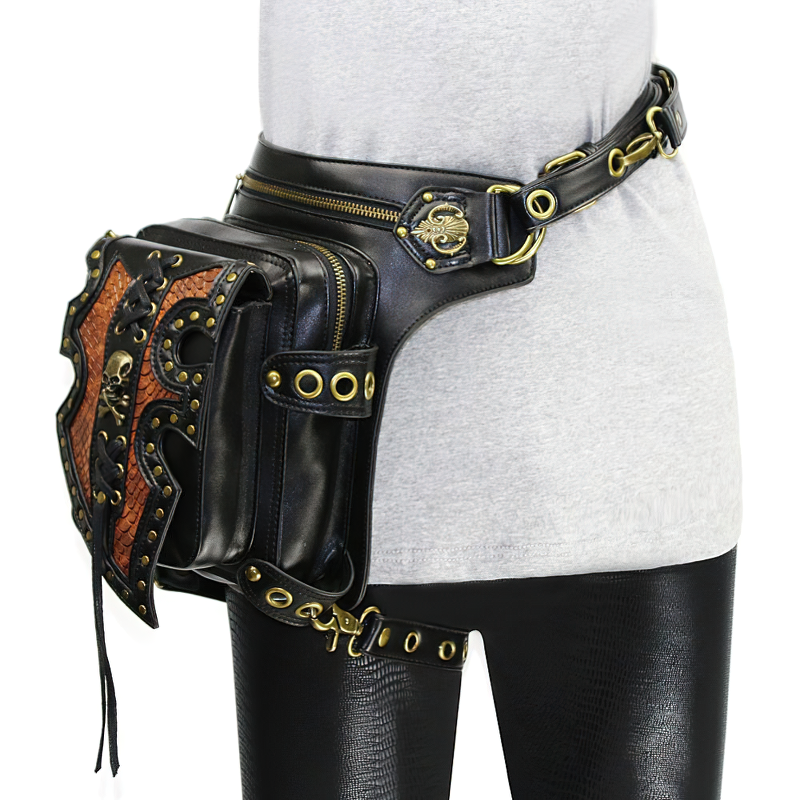 Messenger bag from soft PU and synthetic leather materials for bikers, rockers or goths. It can be a waist bag, a crossbody bag, a shoulder bag. The belt is adjustable. With chains and metal decorations in a steampunk style.