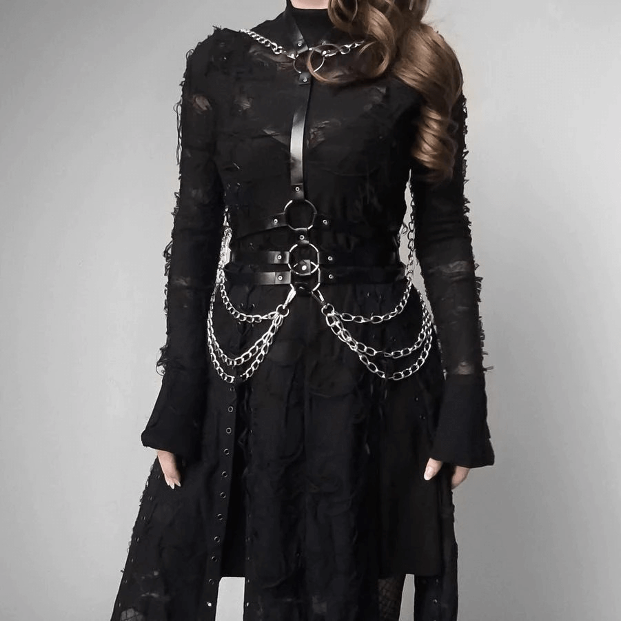 This gorgeous body harness with adjustable suspenders will make a perfect addition to your personal collection, cosplay outfit items or pieces for performing. Made of synthetic leather with a metal element, it has hanging chains and a belt with rings that fits just right.