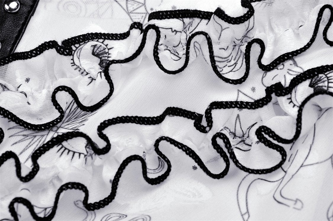 Turn heads in this eye-catching white dress with edgy black lace trim. Inspired by punk and gothic lolita fashion, this unique dress features a strappy bodice, a fitted silhouette, and a playful animal print. The black lace trim adds a touch of dark romance, making this dress perfect for a night out on the town or a cosplay event. Stand out from the crowd and express your individuality in this one-of-a-kind dress.